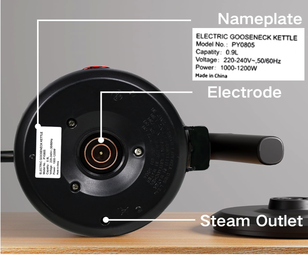 The image below shows the nameplate on the underside of a kettle. This kettle has a maximum power requirement of 1200 W or 1.2 kW.