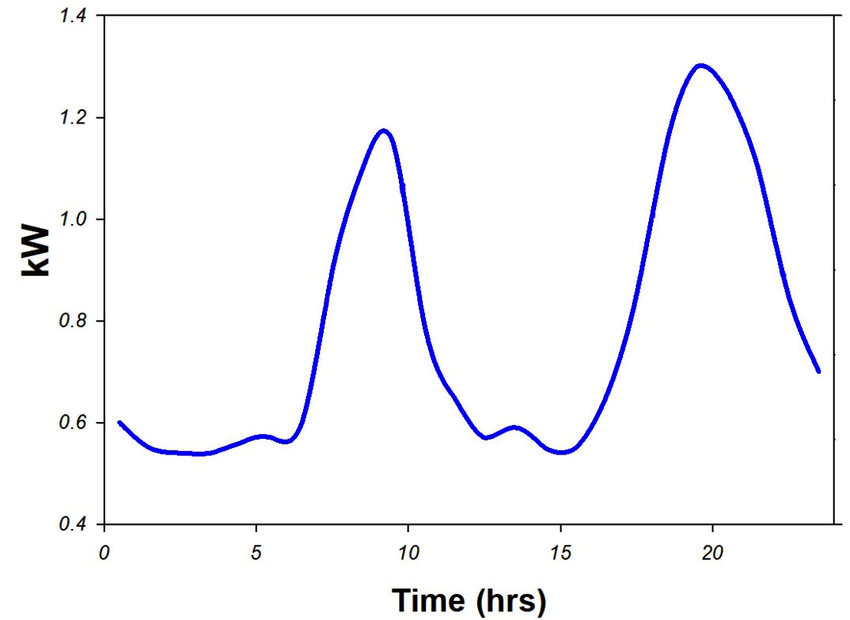 There are a couple of ways to determine your peak load. The first is with an energy meter. Your energy meter will show you the peaks in your building’s load, and you can size the inverter accordingly. One thing to keep in mind though: if your energy meter takes readings once every hour, or once every 30 minutes, you might miss some peaks in between. A kettle, for example, takes a few minutes to boil but has a high power requirement. Your energy meter will most likely miss this load unless it takes readings every minute. The image below shows a load profile from an energy meter. For this building, the peak load is around 1.3 kW.